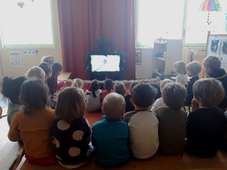 Les contraintes sanitaires rendant la lecture à voix haute impossible, les textes des histoires ont été enregistrés et les illustrations de l’album numériquement découpées et animées pour en faire une suite de contes de Noël. Ces films ont été présentés aux petits de l’école chaque matin des 11 jours d’école précédant les vacances de décembre. L’écran était « déguisé » en sapin de Noël que les enfants ont décoré eux même avec goût et enthousiasme.